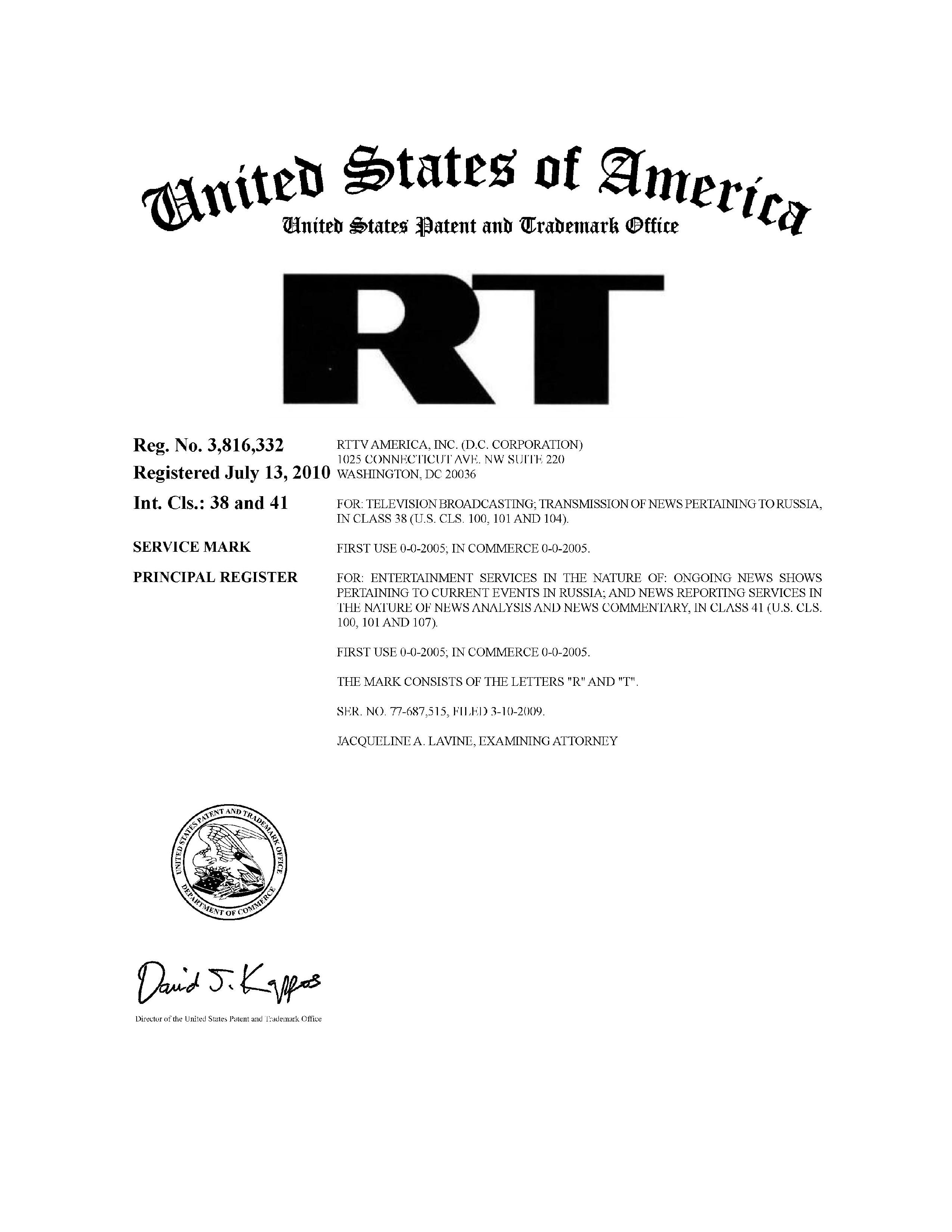 The trademark was obtained by RTTV America Inc., the commercial entity through which RT America operates in the United States.