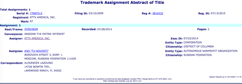 However, this is a fig leaf. RT’s own trademark application, shows that RTTV America assigned its entire interest in the trademark to ANO TV-Novosti in Moscow.