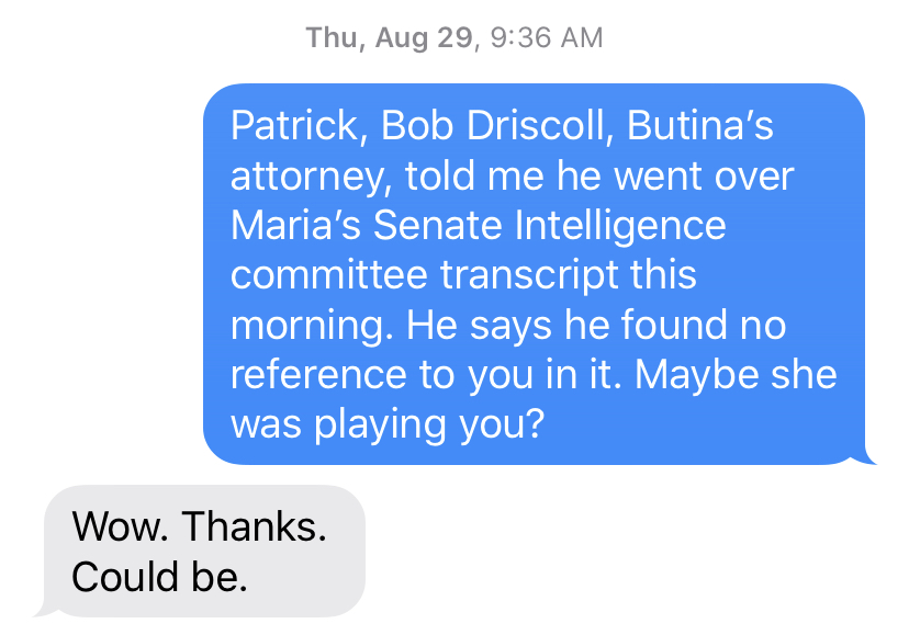 I checked with Butina’s attorney, Robert Driscoll. Butina’s Senate testimony isn’t public but he had a copy and he reviewed it at my request. “No reference to Patrick after a pretty close skim,” he emailed me.