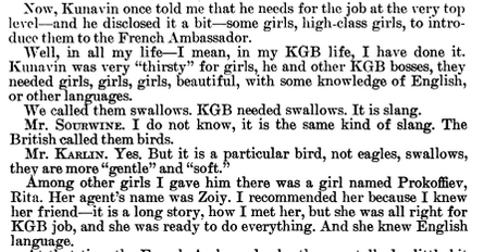 Krotkov said he “recommended” — procured, one might say — “swallows” for the KGB. “The swallows are clever girls,” Krotkov continued, “they want all sorts of jobs with foreigners, they dream about them, even if it is risky, because they hope, they would marry them, maybe they would go abroad.”