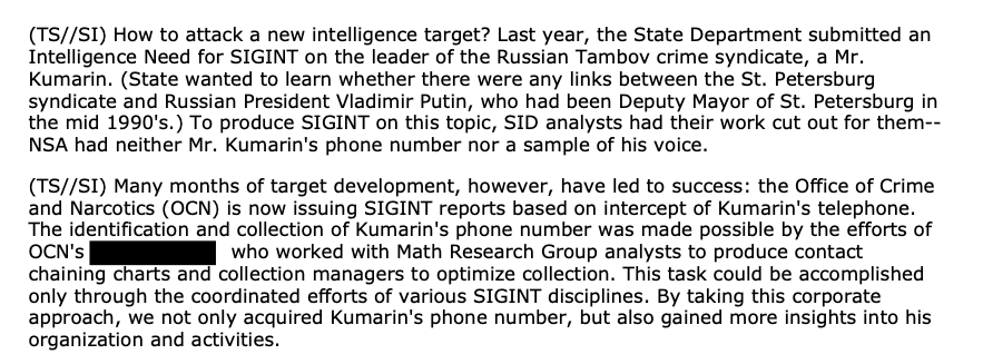 A 2003 memo revealed that NSA was tracking a Russian organized crime boss, Vladimir Kumarin, at the request of the State Department. State wanted to know if there were links between Kumarin’s Tambov gang, based in St. Petersburg, and Vladimir Putin.