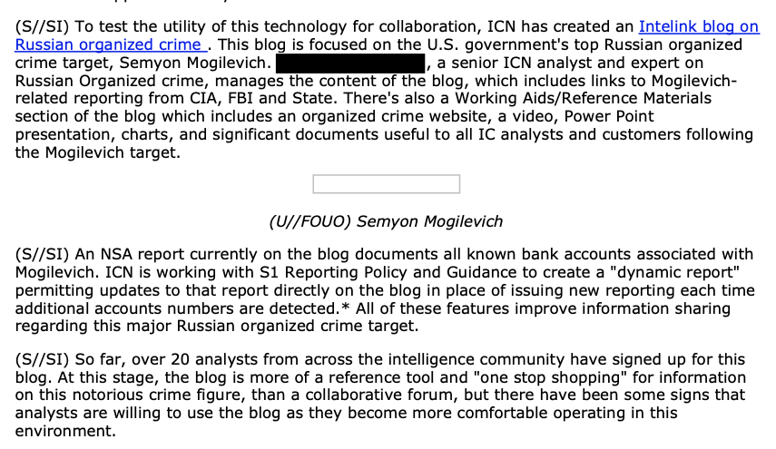 Finally, in 2006, the NSA let its employees know of a interagency intelligence blog devoted to the latest bank accounts and other information collected on Semion Mogilevich, “the U.S. government’s top Russian organized crime target.”
