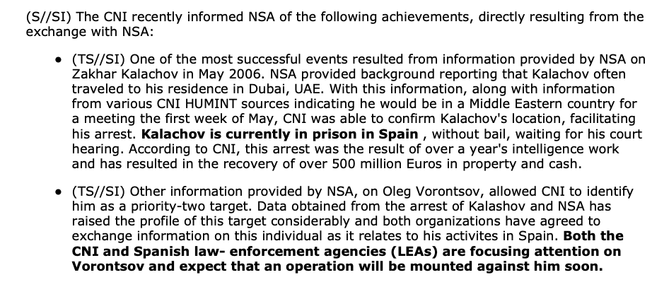 In 2006, NSA expanded its relationship with Spain’s Centro Nacional de Inteligencia (CNI) to target Russian organized crime bosses. There were numerous targets of mutual interest to both countries, including Zakhar Kalachov who was arrested in Dubai in 2006.