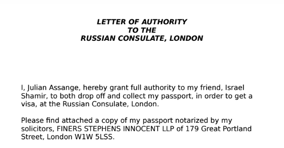 In letter dated Nov. 30, 2010 that was obtained by The Associated Press, Assange asked the Russian consulate in London for a visa.