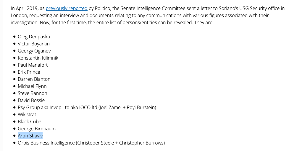 According to a scoop by independent journalist Scott Stedman, Shaviv’s name was mentioned in a subpoena issued in April 2019 by the Senate Intelligence Committee to Walter Soriano, a British security consultant whose connections to Israeli intelligence and Russian oligarchs was the subject of one of my previous posts.